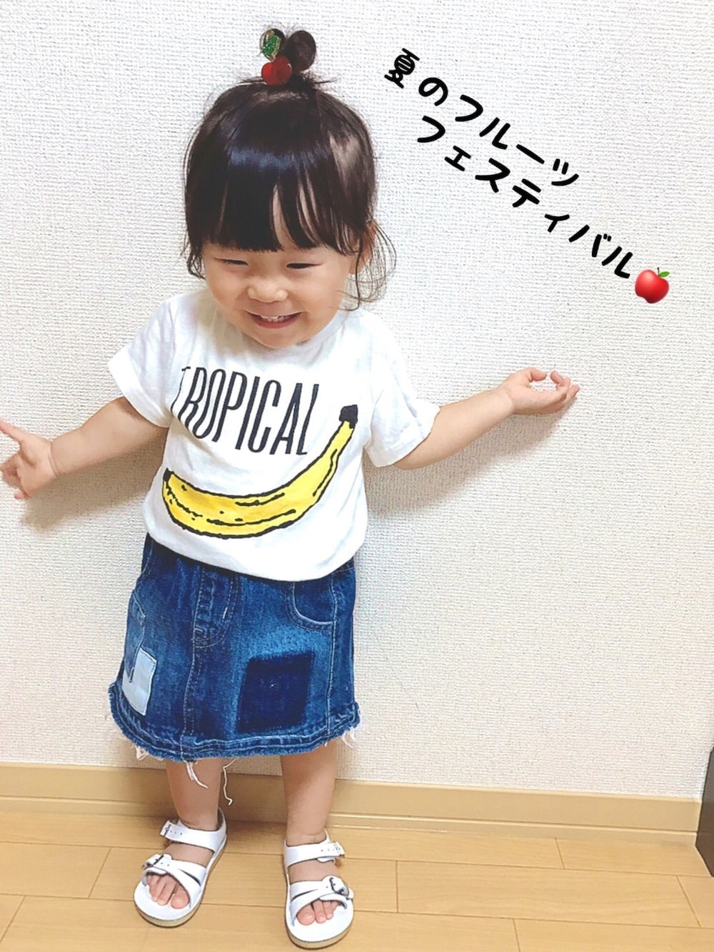 ご覧頂きありがとうございます🙇💓 いつも♡、お気に入り、コメント、フォロー嬉しいです😊❤️ 今日のメイさん。 夏のフルーツフェスティバル🍌 の巻。 本日はバナナマン🍌✨ ということで、盛り上がってる夏のフルーツフェスティバルに参加させてください🙋💓 主催のひなこちゃん、姫まりちゃん、ケンタくんよろしくお願いします☺︎☺︎ メイは1番好きなフルーツのバナナをチョイス☝️💓 このTシャツ去年のだけどまだまだ着れました♡ リメイクデニムのスカートでカジュアルに✨ おだんごにちっちゃなりんごちゃんがいまーす🍎 SHIPSキッズのヘアアクセってちょっとお高いけど可愛いのばっかりで大好き🤤💓 このりんごちゃんはメイが選んで買いました✊ 母はフラミンゴが欲しかったな…😭笑 髪もだいぶ結べるようになったので、ヘアアクセ探しにハマってます🙊❤️ やっぱり夏に着るフルーツ柄って可愛くって大好きー😘💓 皆んなのフルーツコーデもこれからゆっくり見させてください👀🙌 今日は午前中から支援センターで沢山遊んできたので、午後はゆっくりお昼寝してくれますように😪