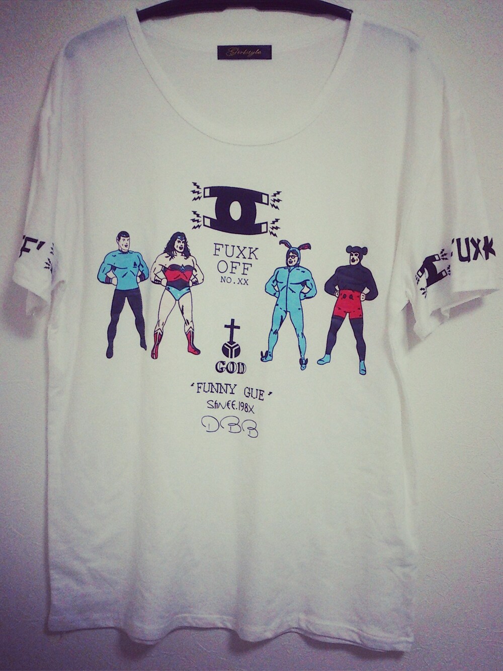 個人的にツボなTシャツです。 ヒーローなのか、変態なのか、そんなプリントがたまらないです。 ビッグサイズなので、スキニージーンズ×カモフラリュックでメンズライクにスタイリングします。