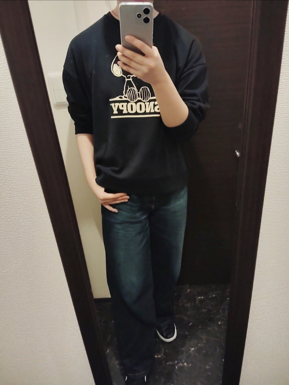 スヌーピーのトレーナー💙 ワイドなデニム💙 いつものスニーカー🖤 で、動きやすいスタイル トレーナーは綿素材で着やすいです😁 今日なんかモヤモヤすることが😢