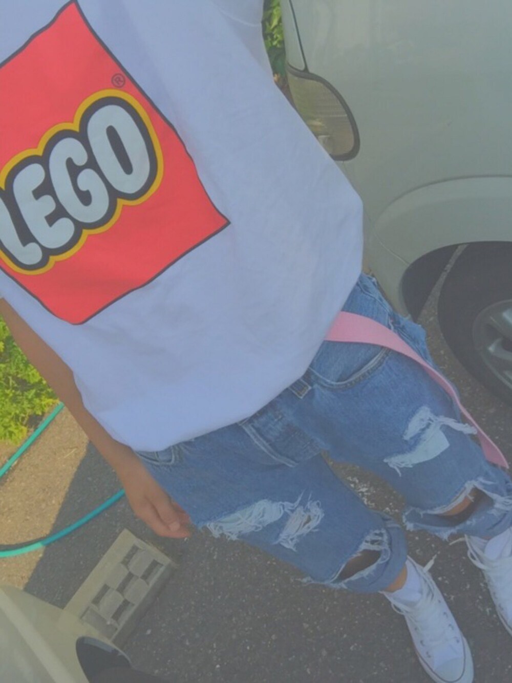 今トレンドの、ガチャベルト+ダメジーンズに、白のCONVERSE