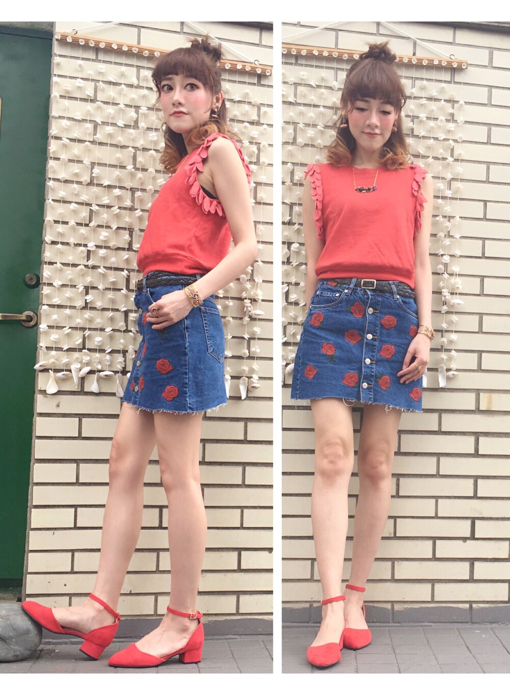 久しぶりに膝上のスカートを履きます笑 しかもデニムスカートはここ十年間はほぼ一度も履かなかったような気がします😂😂 こないだザラのセールに行ったら薔薇刺繍模様に惹かれて、セール品もないのについ買ってしまいました(΄◞ิ౪◟ิ‵) 今日のコーデポイントはパッて見たら誰も分かると思います(´ . .̫ . `) 全身は赤色を要素に決め、台湾の真夏日に非常に相応しいと思いません笑笑