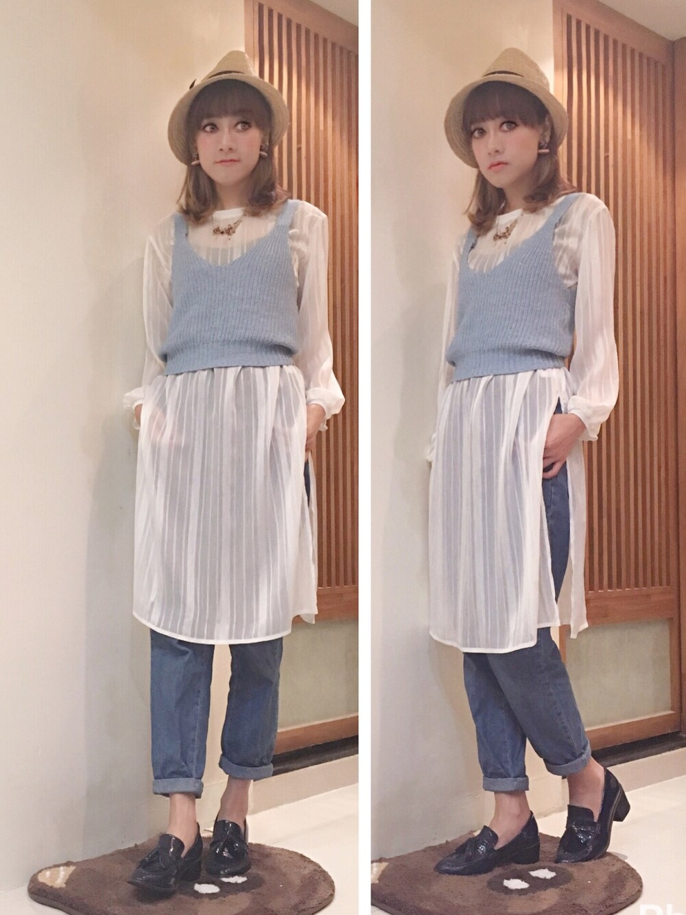 青空の下でピクニックをイメージし、 青や白二色のみを今日のコーデを 決めました。 もう麦わら帽子👒の季節ですね。