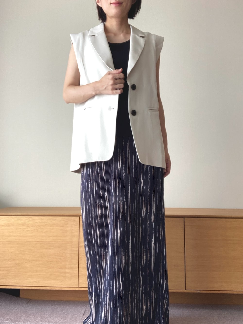コクーンジレはIラインスカートとの相性も◎ すっきりした印象で楽しんでもらえます。ジレは二の腕を細くみせてくれるデザインが嬉しい!
