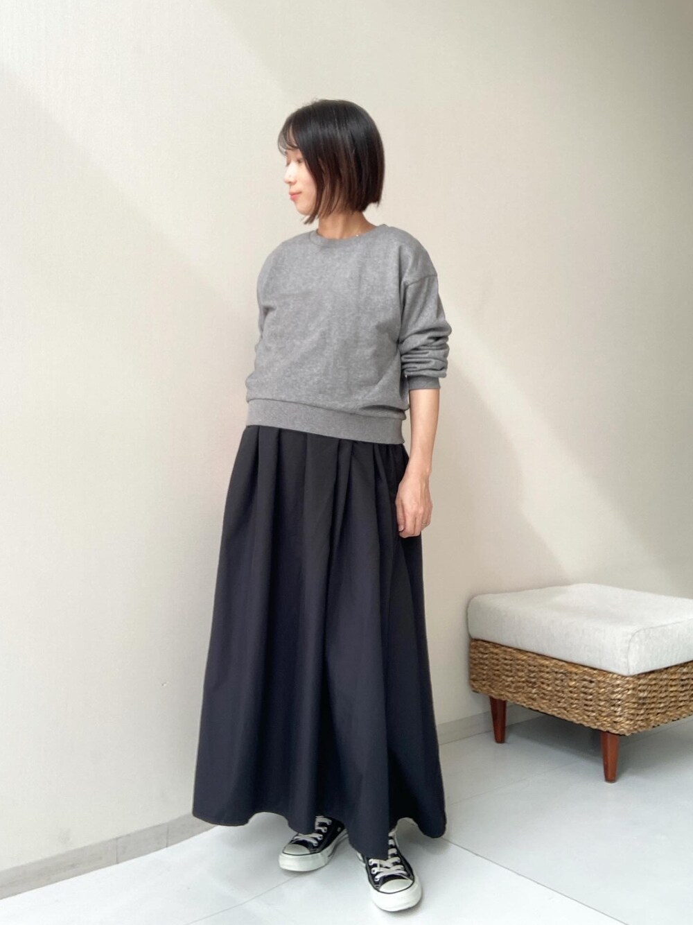 厚手でなく、軽めの生地感のスウェットで着心地も肌触りも抜群です。小柄さんに合わせた丈感で、パンツスタイル、スカートスタイルにバランスよく着れます。キャミワンピースと合わせて、妊娠後期も着用できました。産後は赤ちゃんに触れるのも優しい肌触りで安心。授乳時ももたつくことなく、さっとまくれそうで期待しています。ニットと異なりすぐ洗濯できるのも嬉しいところ。産後はデニムや、ワイドパンツ、チェック柄スカートと合わせて着こなしたいなと思っています。