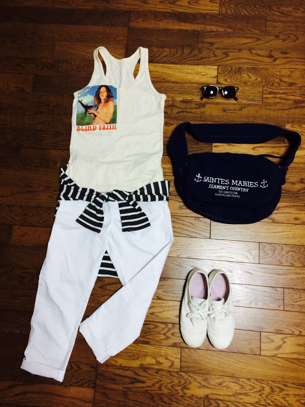 パンツ ブランド不明 ボーダーT 無印良品 バック ブランド不明 スニーカー 無印良品 へそだし…わたしじゃなくてタンクトップの少女がだしてます 笑 大好きな無印良品タグ♪ こんな時間になってしまった。。