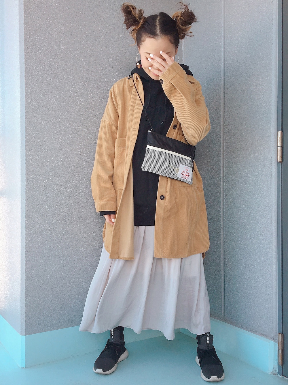 黒のパーカーはepochという神戸の古着屋さんオリジナルブランド「Mormal」のもの!(ユニセックス)。 相変わらずゆったり着れるスウェットが気分だわ〜〜 ZARAのコーデュロイのシャツっぽいアウターは今の時期にちょ〜ど良いですな。 ポケットが謎に大きくて謎の位置なのもかわいい〜 で。サテンのマキシスカートでカジュアルすぎないコーデにしました〜