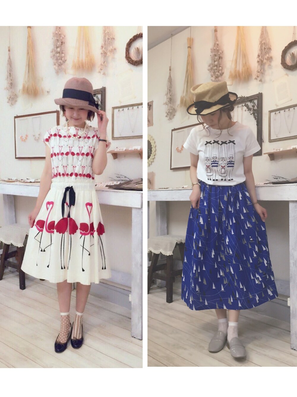 summer code 🐠✨ 大好きなお友達のサトミィちゃんは、 peupres のキュートなフラミンゴワンピース💕 @satosatomiy 私は、マリオネットTシャツ×coccaのヨット柄スカート✨⛵️💙 鮮やかなブルーに、三角形に見えて実はヨット柄というcoccaの生地に一目ボレして、 母にスカートを作ってもらいました◎ 青×白の組み合わせ、好きです♡
