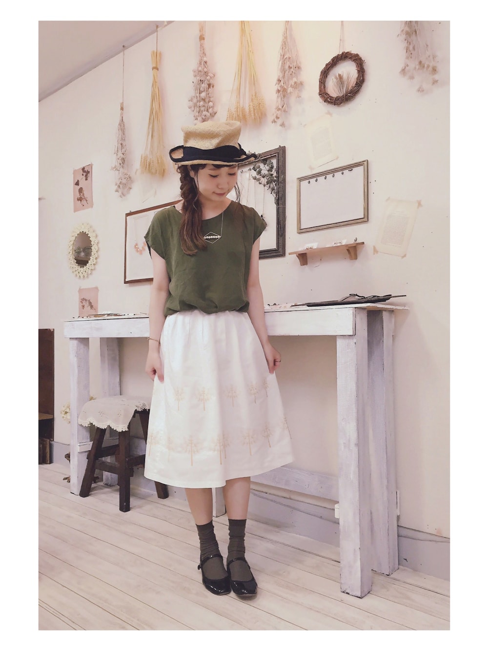 少し秋めいてきたので、 トップスとソックスをカーキに🌿 もちろん、トップスは 母のもの。 カーキが気になるわ〜と言ったら、 持ってるで!と またクローゼットから出てきました◎ スカートは、木の刺繍が入ってて、 可愛いです。 ヘアアレンジは、少し大人っぽく、 サイドに流して、 根元にねじねじを巻きつけて あとは毛先を軽く巻いて下ろしました。 靴下屋のカーキ色ソックス、 とっても使えてお気に入りです◎