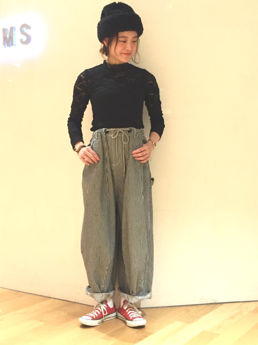 レディなレーストップスをカジュアルに合わせてみました!相変わらずテイストミックスが好きな私です、、、 ボアハットはDECHO、パンツはneedlsです😊 コンバースとリップを赤にしてさりげなく統一感、、、さりげなーくです、、、!