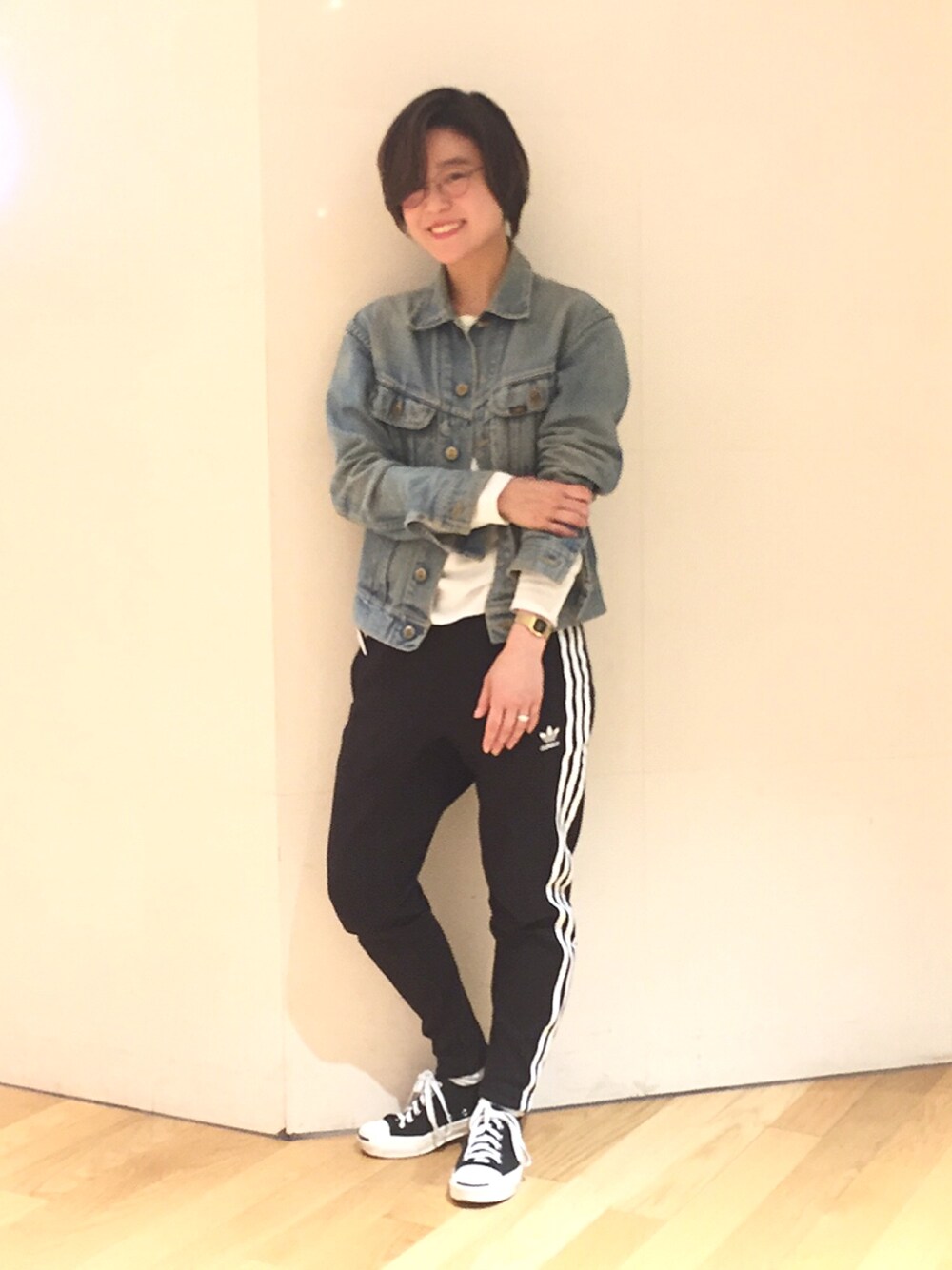 先日のadidas Originalsのパンツを着まわし🔃 Gジャンとスニーカーを合わせてカジュアルに! 色のトーンだけは、抑えめに👍
