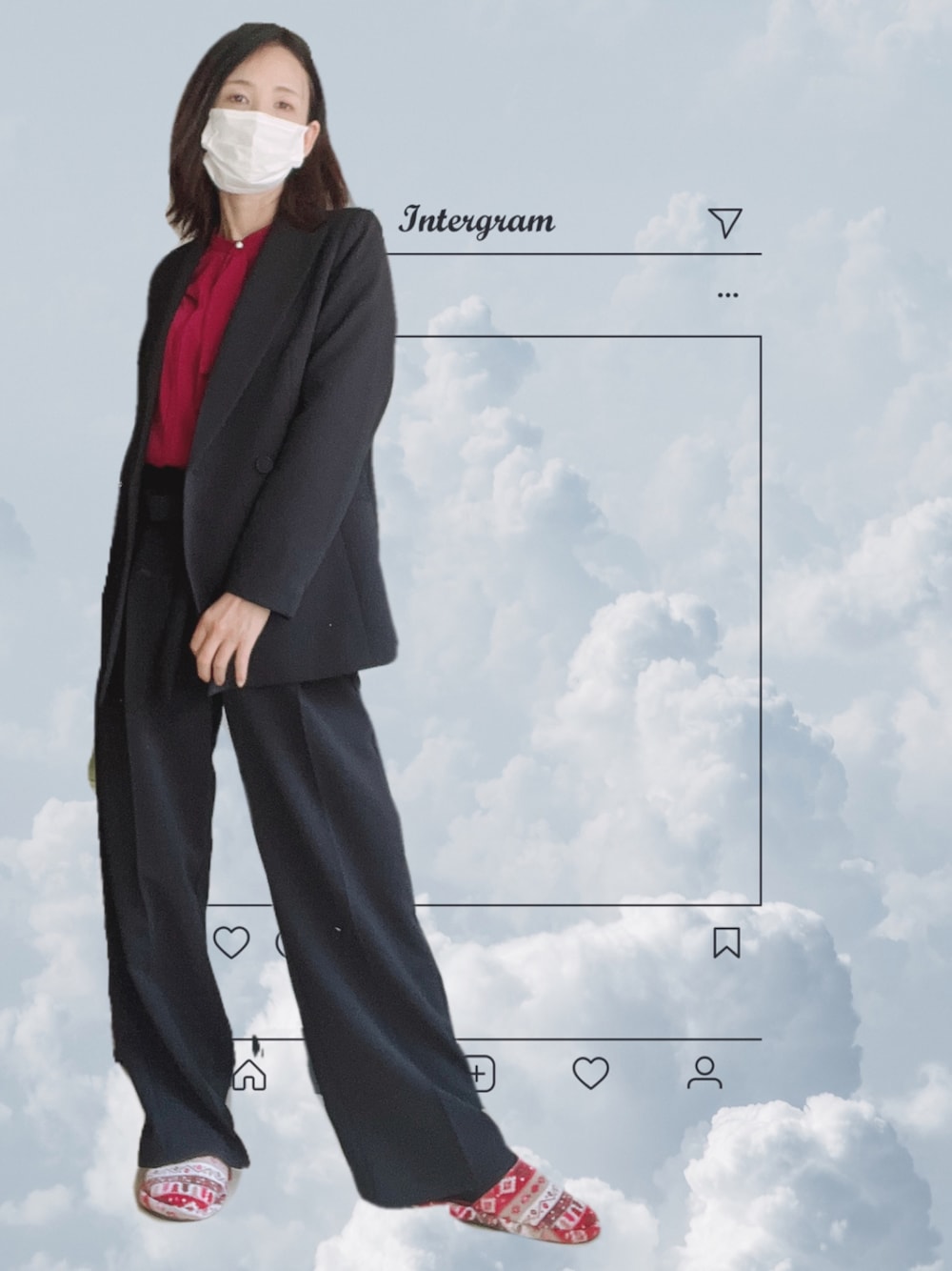 最近、スーツ多い✨ 室内撮影で、スリッパ 笑 ワイドパンツ、超ラク✨ ダブルは初挑戦☺️