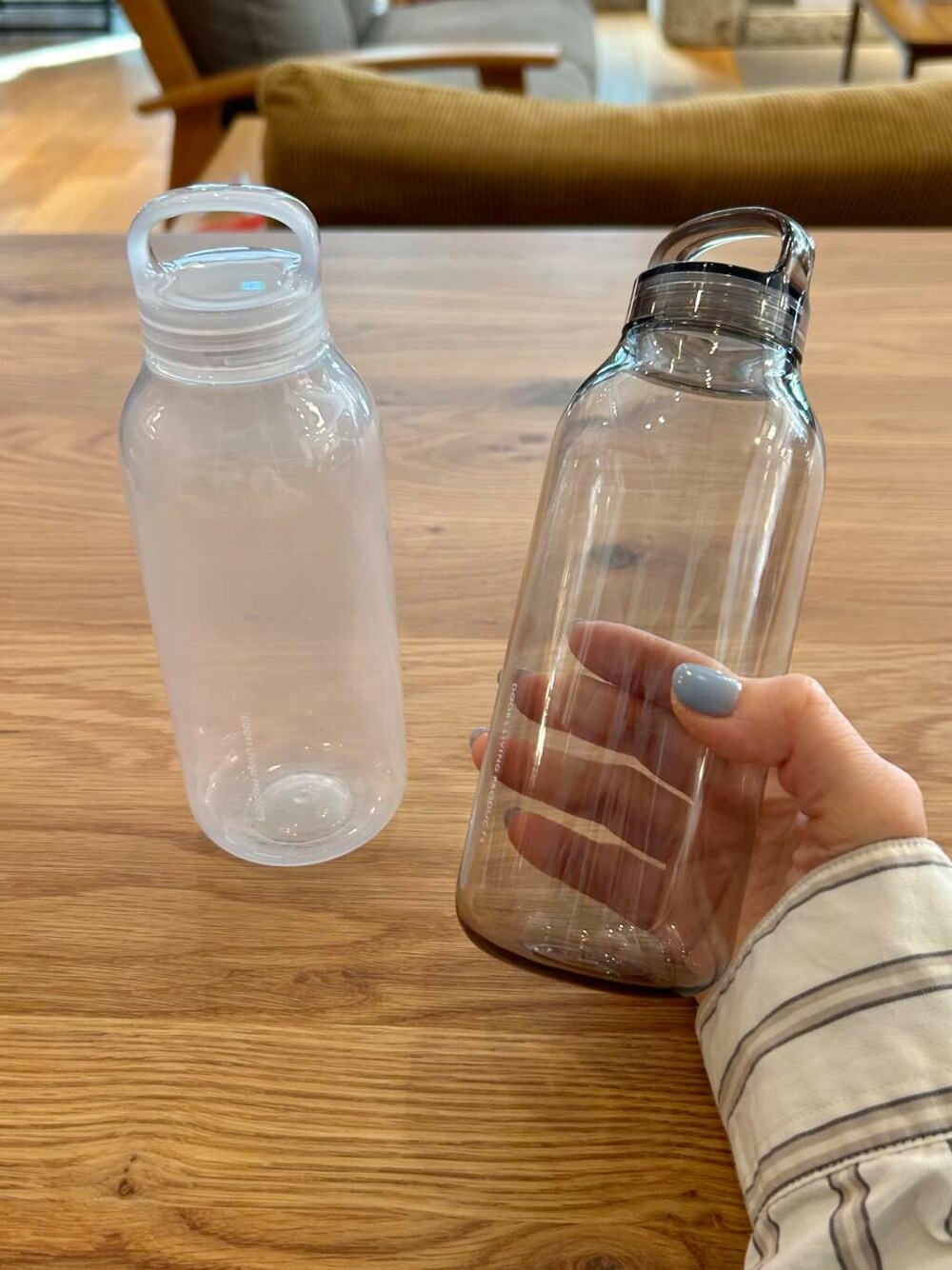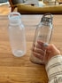 軽量でコンパクトなウォーターボトルです。 キャップに取っ手がついているので持ち運びしやすいデザインです。 mist grayはクリアなグレーでmistは磨りガラスのような淡いホワイトです。 どちらも飲み物を入れるとキレイに見えます。 シンプルなので飽きずに使えます。 洗いやすいところも毎日使うには嬉しいポイントですね。 プレゼントにしても喜ばれそうです^ ^