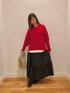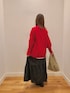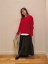 きれいな赤ニットを主役に、ティアードスカートのボリューム感を加えた大人可愛いスタイルにしてみました。 ニットの袖口はリブが長めになっている所がポイントです。Vネックは浅いので今回はロンTを入れましたが、1枚でも着用可能です。 スカートは撥水なので、冬の悪天候でも安心しておしゃれを楽しめますよ♪