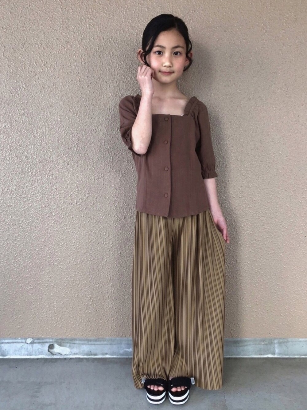 ベージュ系のパンツ、ブラウン系のシャツ/ブラウスを着用したキッズの春コーディネートの1枚目の写真