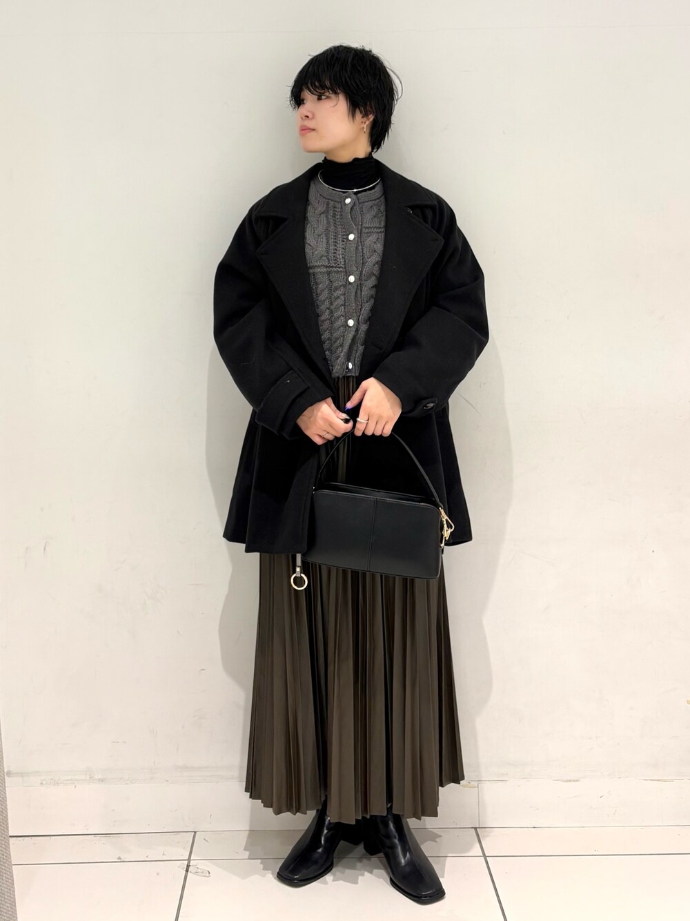 ご覧頂きありがとうございます! コートを着ている時も脱いだ時も可愛いコーディネートを組んでみました! プリーツスカートでキレイめに寄せつつ、シンプルすぎないようにデザインの効いてるニットカーディガンを合わせてあげると🙆♀️ キレイめのコートが着たいけどロングは長いなぁと思っている方にオススメのコートです✨