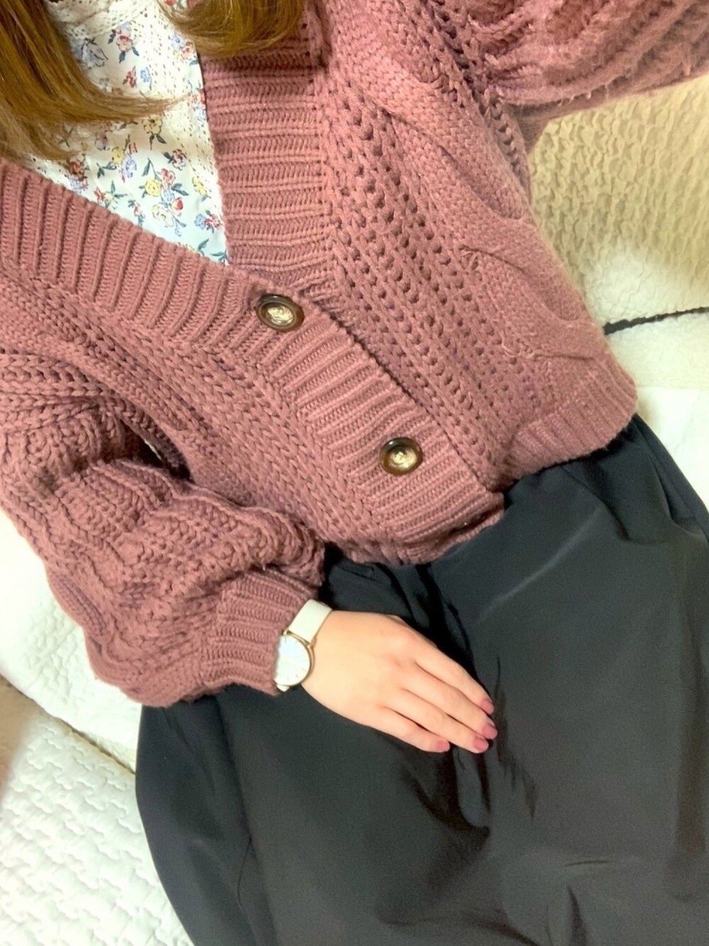 今日のコーデ💗🖤 赤紫ぽいピンクのニットカーディガンなのに写真撮ったら光の加減で色が若干違う😂 ニットとネイルの色合わせた💅 やっぱ仕事でズボンだと休みの日はスカートばかり(笑)