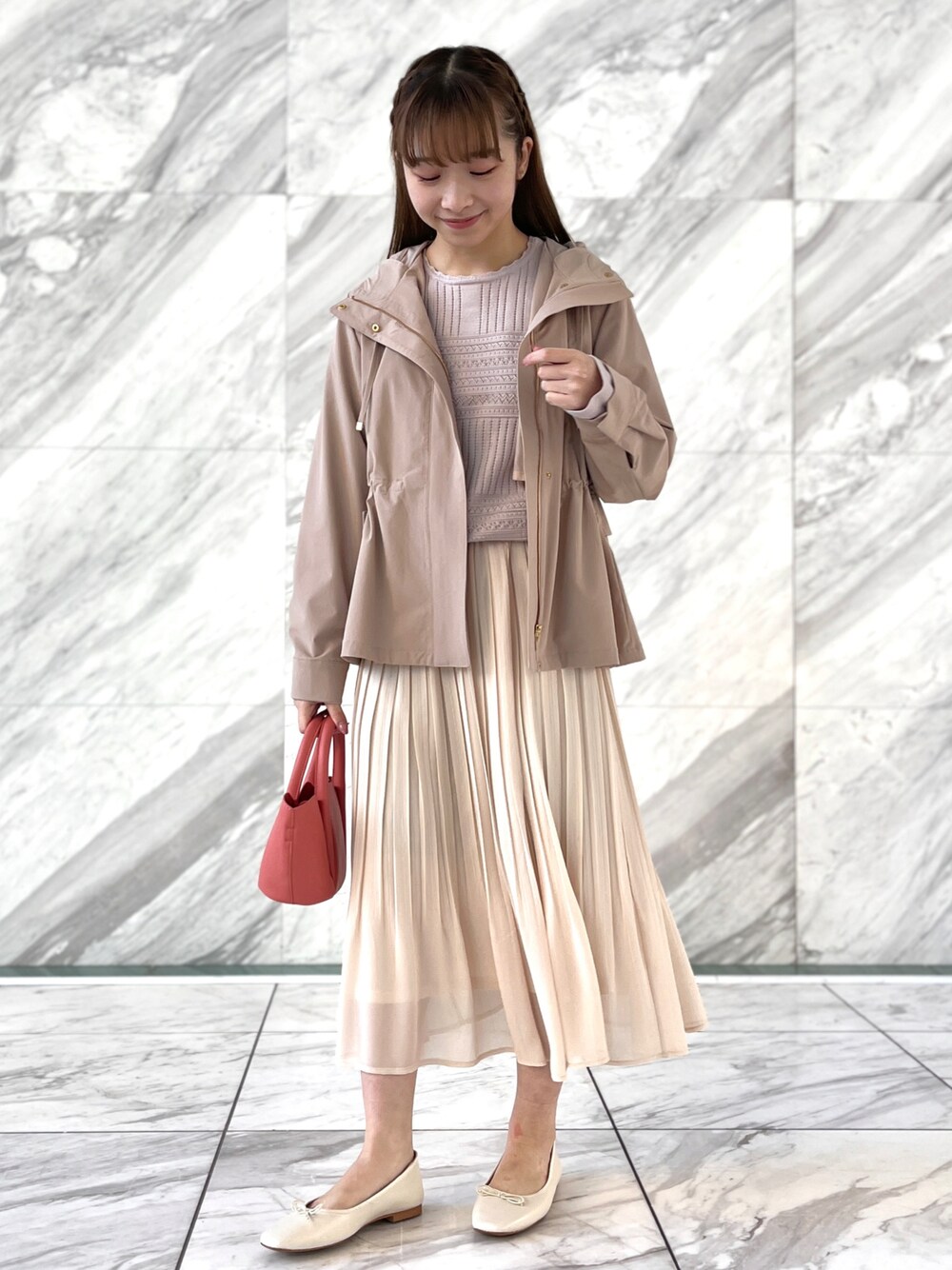 aika/154cm/骨格ウェーブ 【マンパ】 ウエスト部分で絞ることができ、スタイルアップ効果抜群! カジュアルでガーリーな、Couture Broochならではのマンパです♪ 【ニット】 透かし編みのデザインが可愛い一枚。 華やかなカラーと柄で、春を先取りできます。 【スカート】 セレモニー使いできるアイテムを、オフ使いで♪ 裾に透け感があり、低身長さんでも綺麗に着られます。
