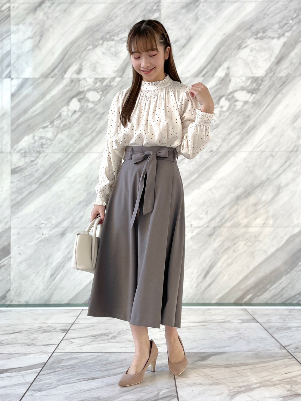 aika/154cm/骨格ウェーブ 【ブラウス】 小さめのドット柄が可愛い一枚! 柄が入ることで、コーデ全体が可愛らしい印象に仕上がります。 【スカート】 とろんと落ち感の綺麗な一枚! ウエスト部分のリボンは付け外し可能◎ シーズンレスで着回せるアイテムです。