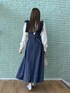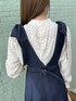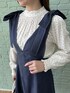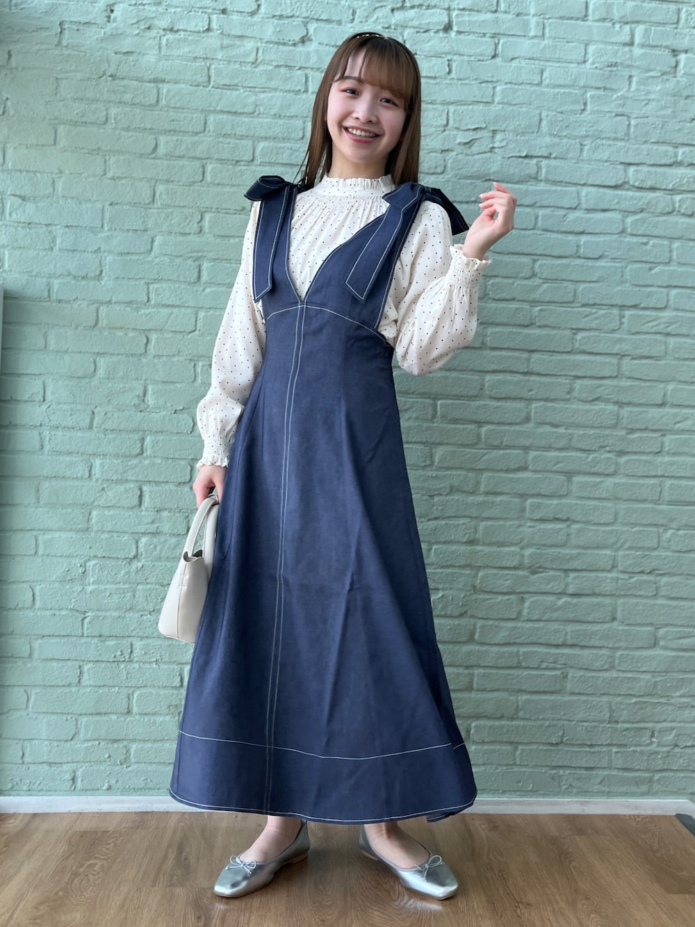 aika/154cm/骨格ウェーブ 【ブラウス】 衿と袖のフリルが大人可愛い一枚。 細かいドットは控えめに華やかさをプラスしてくれます。 【ジャンスカ】 フレア分がキレイなジャンスカ。 デニム調の素材なので、軽く切られます。 リボンは取り外し可能です◎