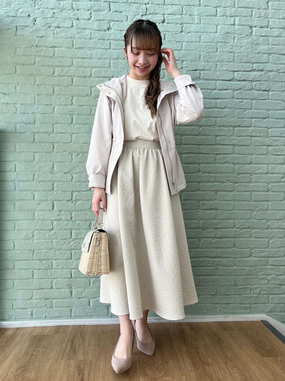 aika/154cm/骨格ウェーブ 【アウター】 クチュールブローチのマンパは、着丈が短く、ウエストドロストも入っているのでスタイル良く着られます◎ 【トップス】 お袖の透け感が上品な春ニット。 モックネックとのバランスが絶妙な一枚♪ 【スカート】 流行りのジャガード素材! よく見るとお花の形にポコポコと膨らんでいます。