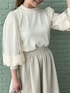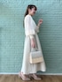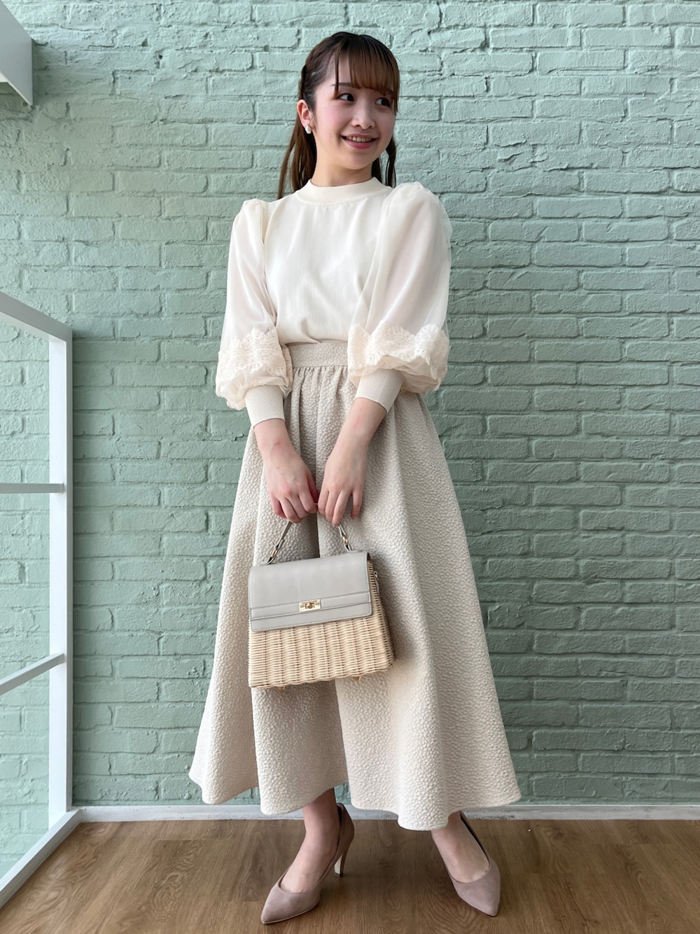 aika/154cm/骨格ウェーブ 【トップス】 お袖の透け感とレースが可愛い一枚! 見頃はすっきりしており、スタイル良く着られます。 【スカート】 綺麗な膨らみのジャカードスカート。 後ろウエストがゴム仕様になっており、ニットトップスをインしても楽に着られます♪