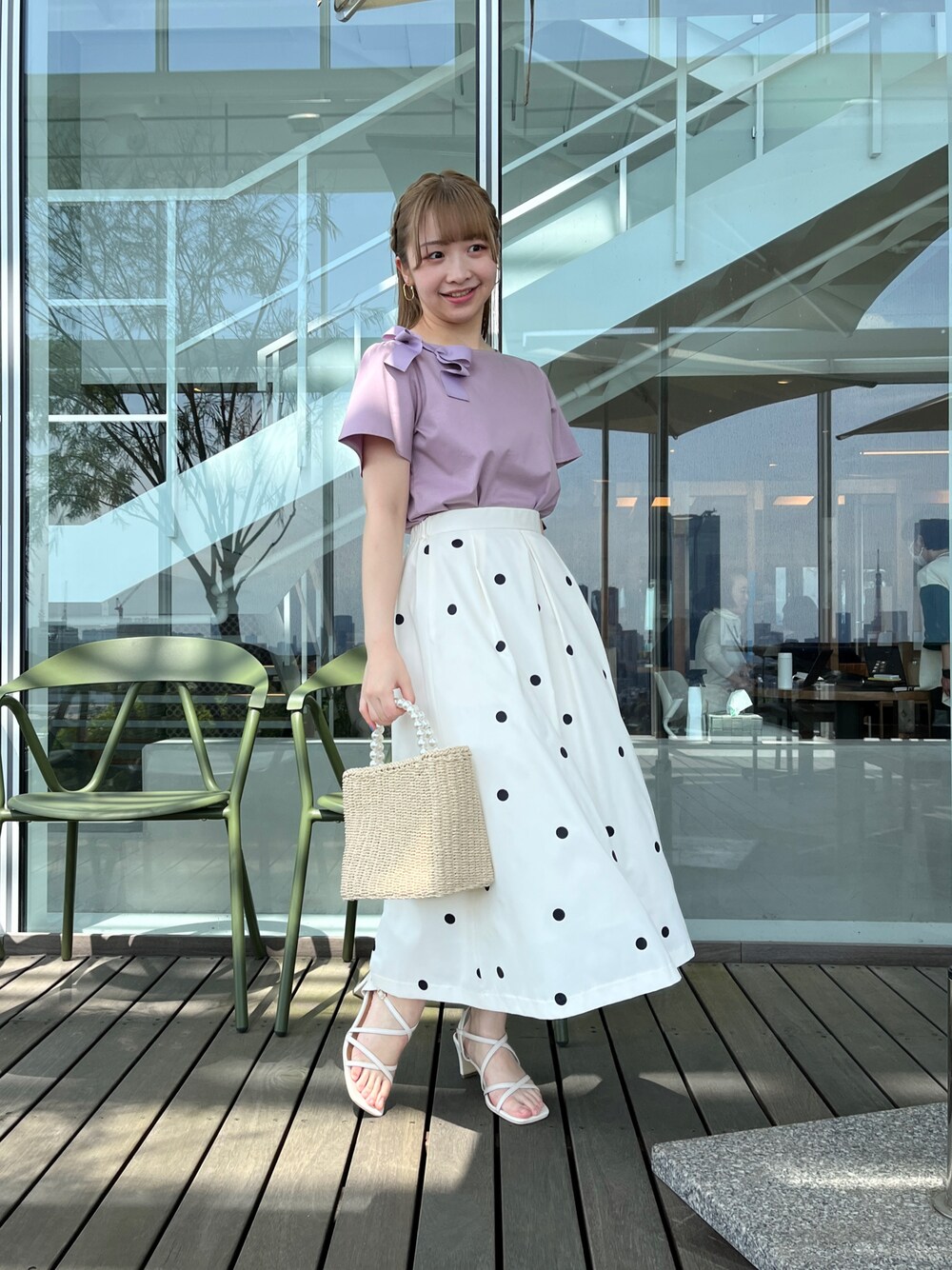 aika/154cm/骨格ウェーブ 【トップス】 胸元のリボンが可愛いTシャツ。 お袖も少しフレアになっていて、大人可愛く着られます。 【スカート】 感覚広めのドット柄は、子供っぽくならず、コーデを上品に可愛く仕上げてくれます。