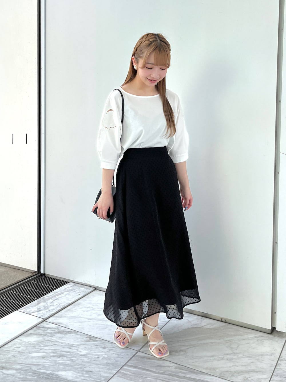 aika/154cm/骨格ウェーブ 【トップス】 お袖の刺繍が可愛い一枚。 程よく肌見せできるアイテムです。 なめらかなコットン100の素材で、夏でも涼しく着られます。 【スカート】 透け感が上品なスカート。 控えめなドット柄で、コーデをほんのり華やかにしてくれます。