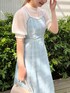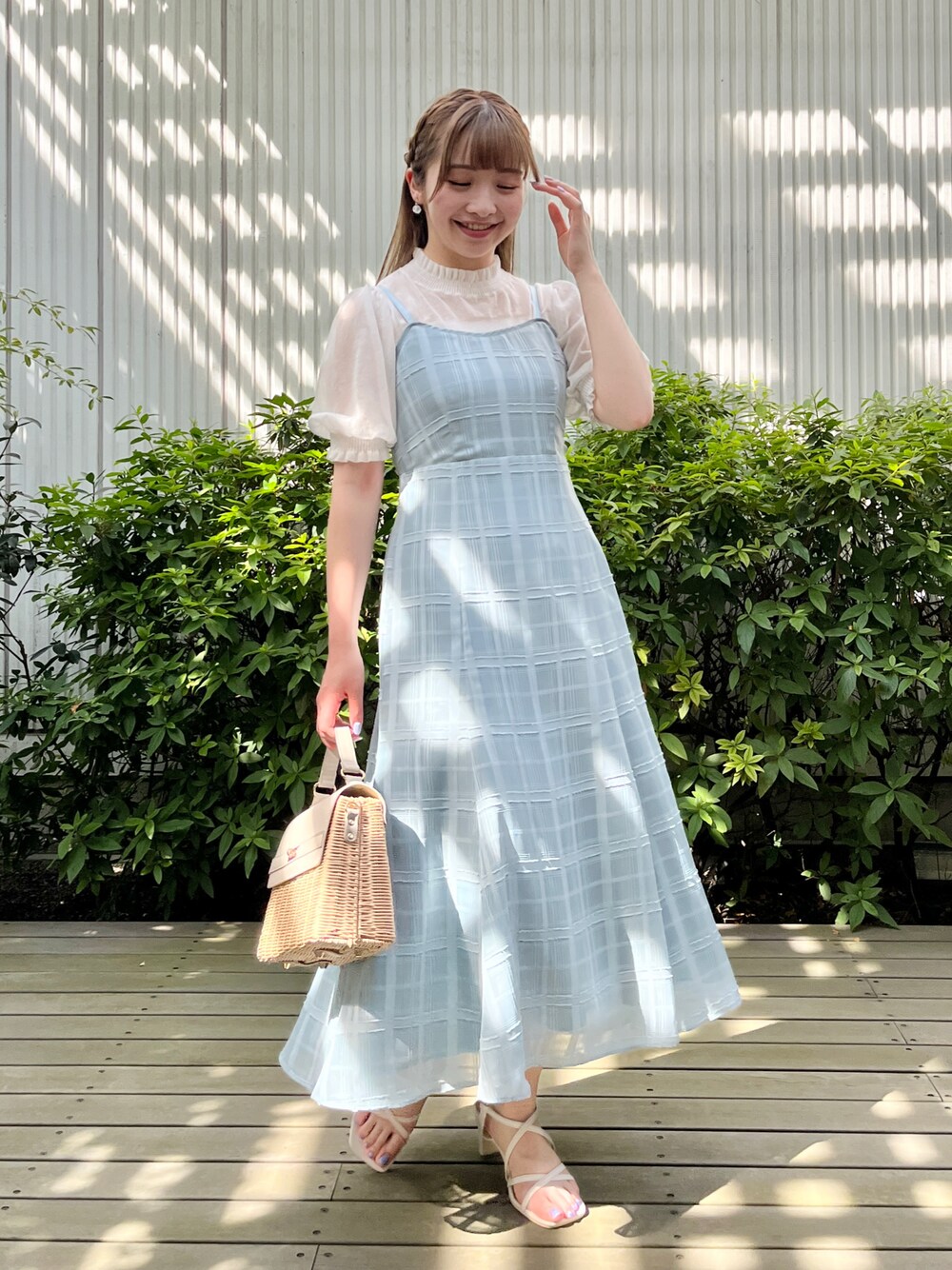 aika / 154cm / 骨格ウェーブ 【トップス】 お袖とデコルテ部分に透け感があり、夏らしく着られます。 【キャミワンピ】 シアー感のある素材で、軽やかに切られます。 肩紐で調節ができるので、低身長さんでもキレイに着られます。