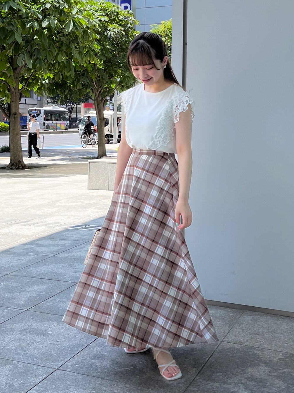 aika / 154cm / 骨格ウェーブ 【トップス】 レースが華やかなアイテム。 Tシャツ素材で着心地も抜群です◎ 【スカート】 フレア分たっぷりのスカート。 シャリっとした素材でシワになりにくく、夏でも涼しく着られます。