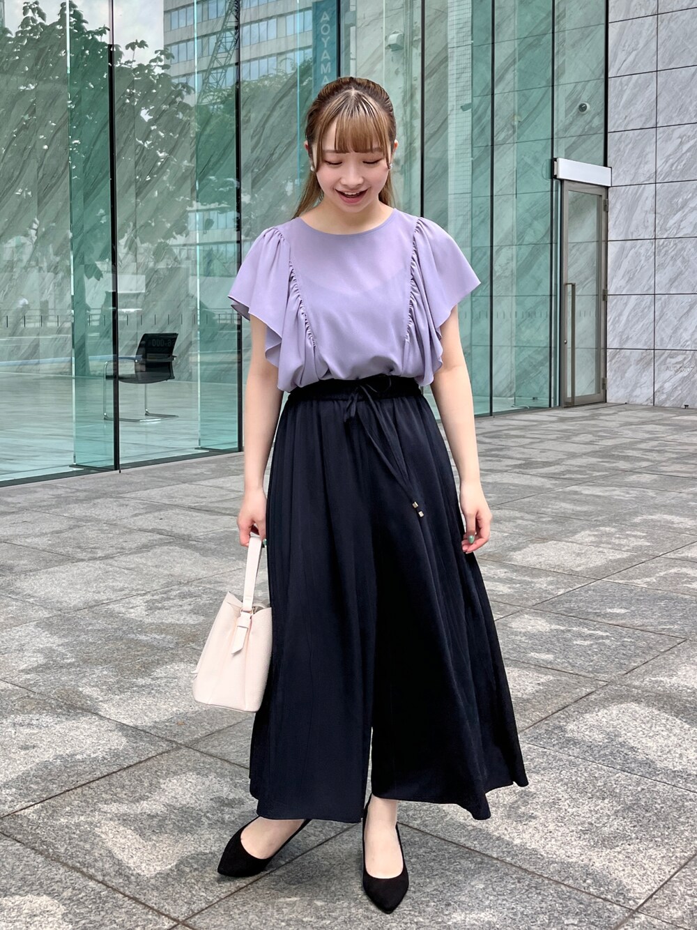 aika / 154cm / 骨格ウェーブ 【ブラウス】 サラッとした柔らかい素材。 フリルのお袖が二の腕をキレイにカバーしてくれます。 【パンツ】 とろんと落ち感のキレイなパンツ。 スカート見えする一枚です。