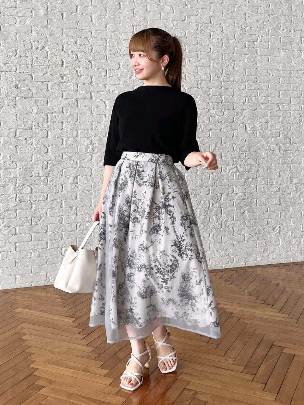 aika / 154cm / 骨格ウェーブ 【トップス】 後ろのパールが華やか◎ サラッとしたサマーニット素材です。 【スカート】 花柄生地にオーガンジーが重なったデザイン♪