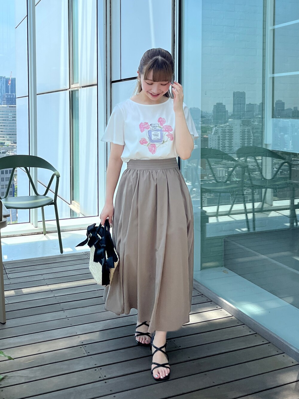 aika / 154cm / 骨格ウェーブ 【トップス】 毎年定番のクチュールブローチTシャツ! 滑らかなコットン素材で、綺麗に着られます。 【スカート】 夏らしい素材のロングスカート。 淡いベージュは使いやすく、合わせるお洋服を選びません◎