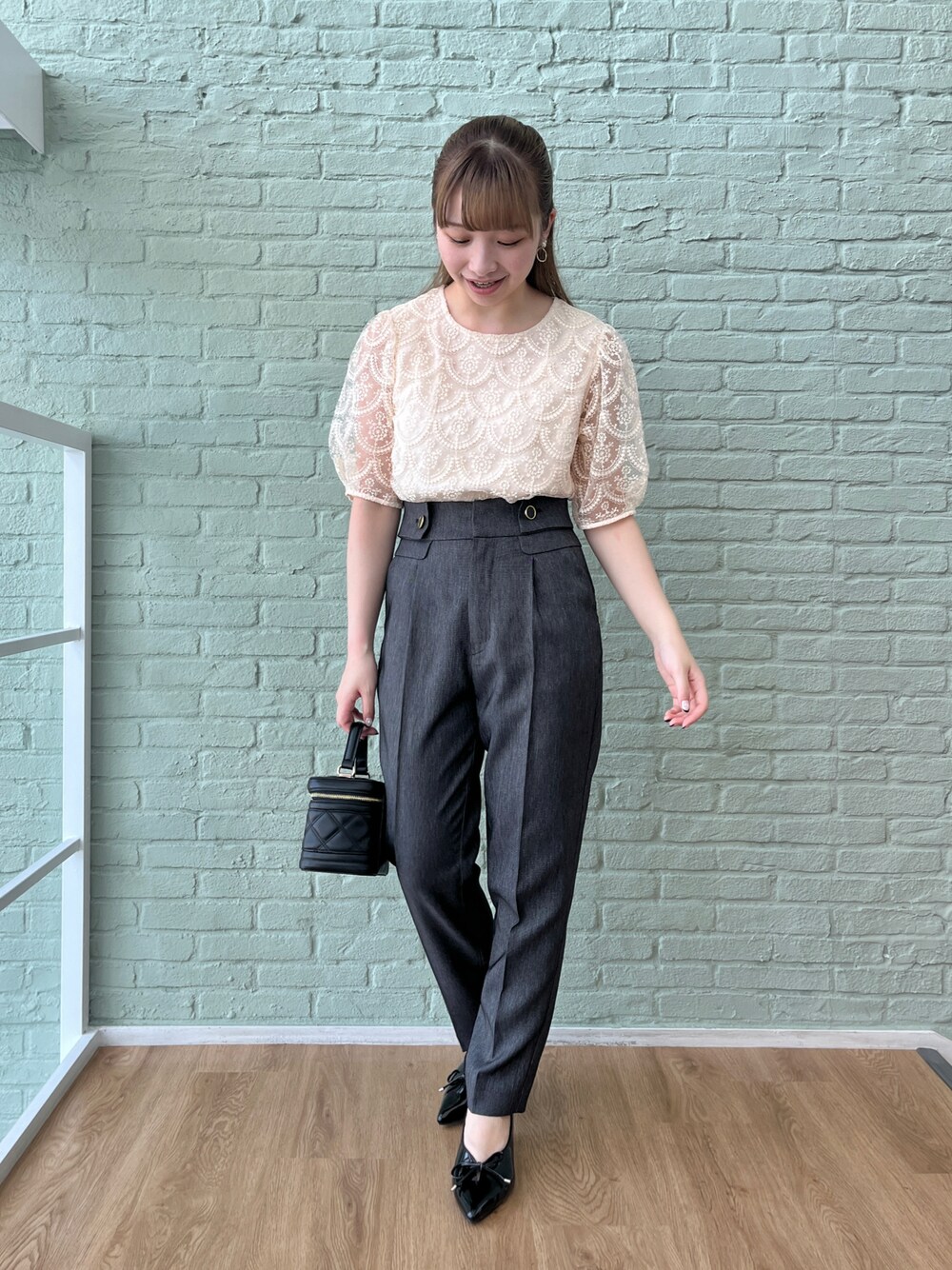 aika / 154cm / 骨格ウェーブ 【トップス】 刺繍のデザインが着映える一枚。 お袖が透けていて、夏らしく着られます。 【パンツ】 デニム調の素材で、軽くシャリっとしています。 テーパード型で、太ももやお尻をふわっと隠してくれます♪