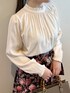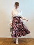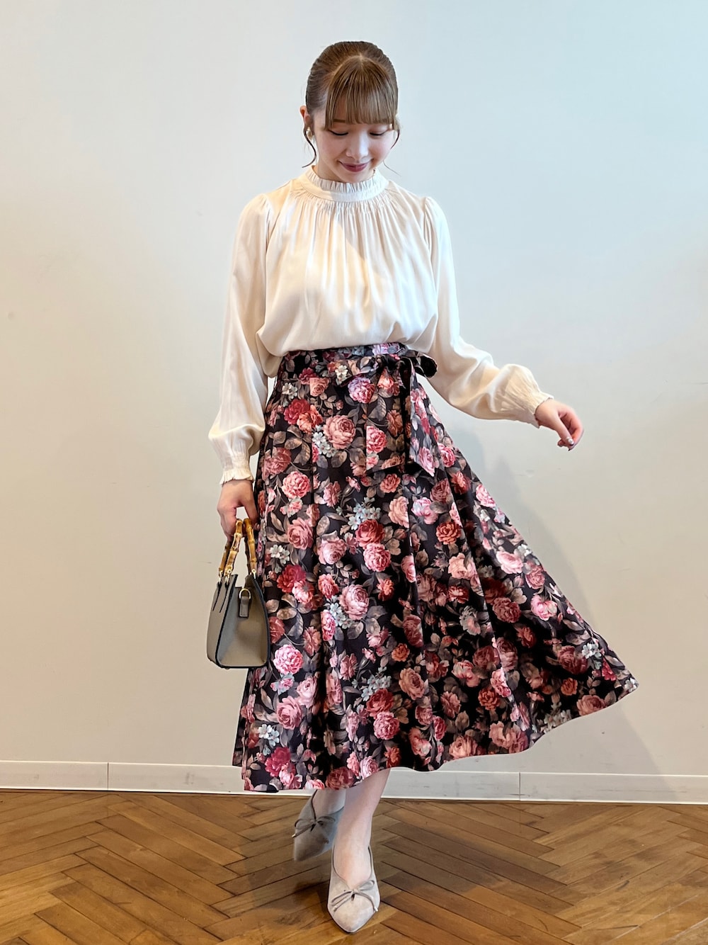 【ブラウス】 控えめなフリルとシャーリングが、シンプルながらも華やかな一枚。 前後2wayで着られます。 【スカート】 花柄が豪華なスカート。 特別なおでかけに着ていきたい一枚。