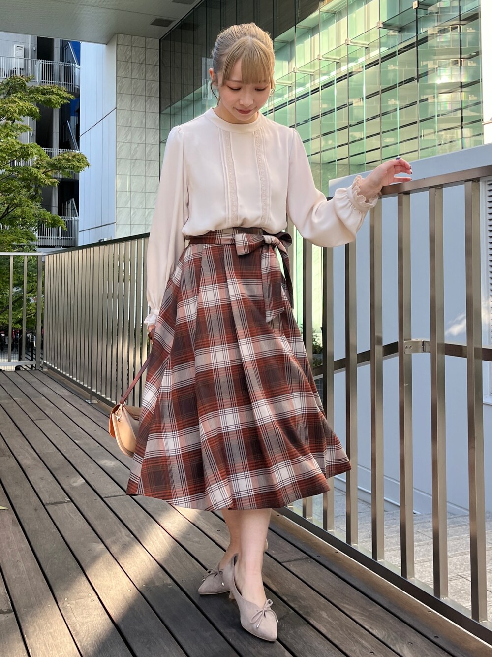 aika / 154cm / 骨格ウェーブ 【ブラウス】 タックデザインが華やかなブラウス。 袖口のレースも可愛いポイントです! 【スカート】 チェック柄が秋冬らしい一枚。 ふわっととろんと、柔らかい素材です。