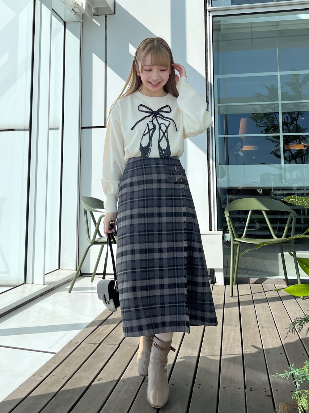 aika / 154cm / 骨格ウェーブ インスタ→@aika_pcure 【トップス】 フロントデザインが着映えるデザイン。 パールとリボンは本物を縫い付けてあります。 【スカート】 ベルト風のデザインがすっきり見えするポイント。 膝下丈で綺麗に着られます。