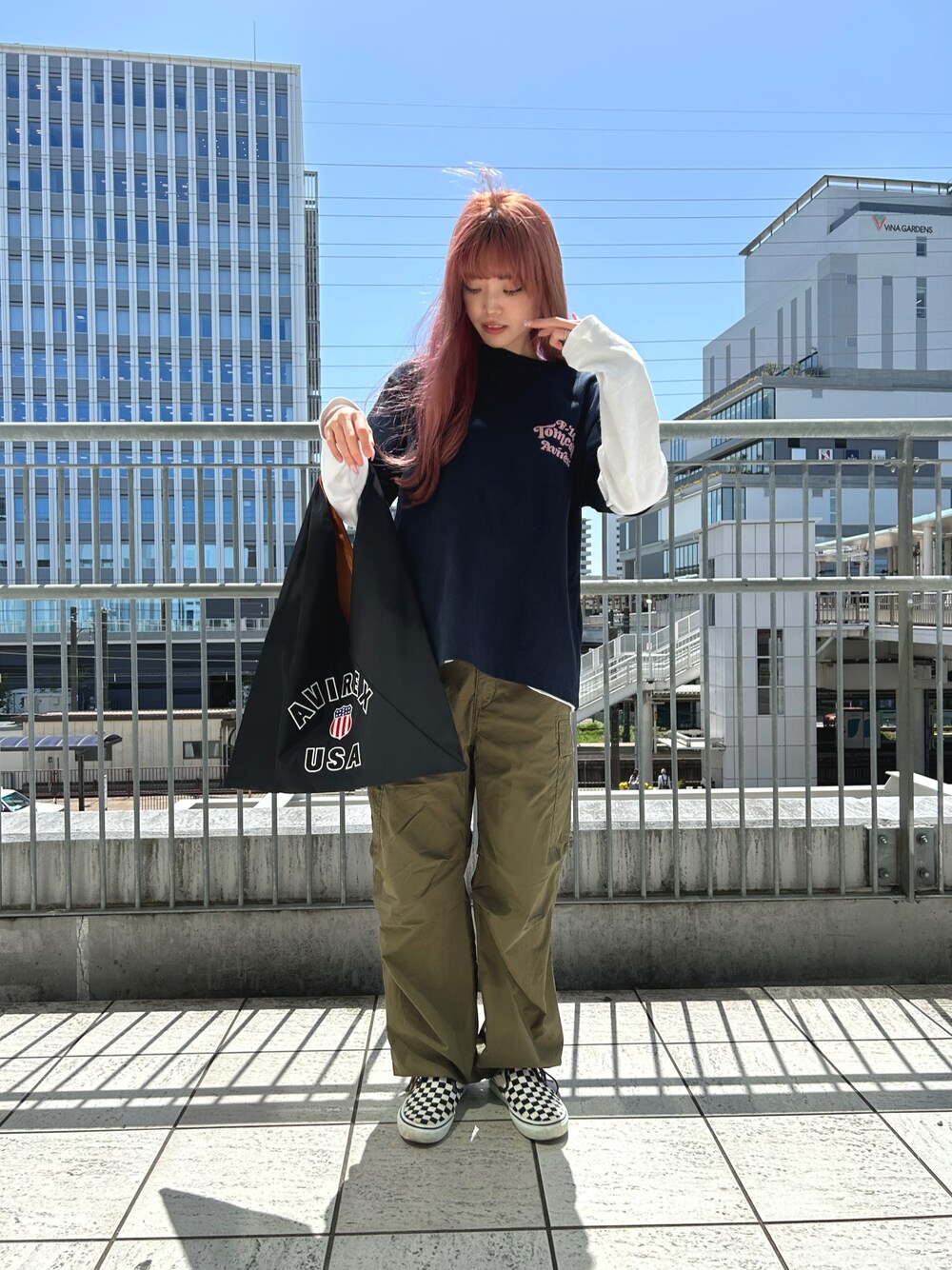 AVIREX海老名店style ·身長:158cm ·着用サイズ カットソー:F パンツ:S ピンクの文字と後ろのtomcatが可愛いです〜🥺💞 神奈川県海老名市扇町13-1 ららぽーと海老名2F TEL:046-200-8816 営業時間10:00〜20:00(土日祝10:00〜21:00)