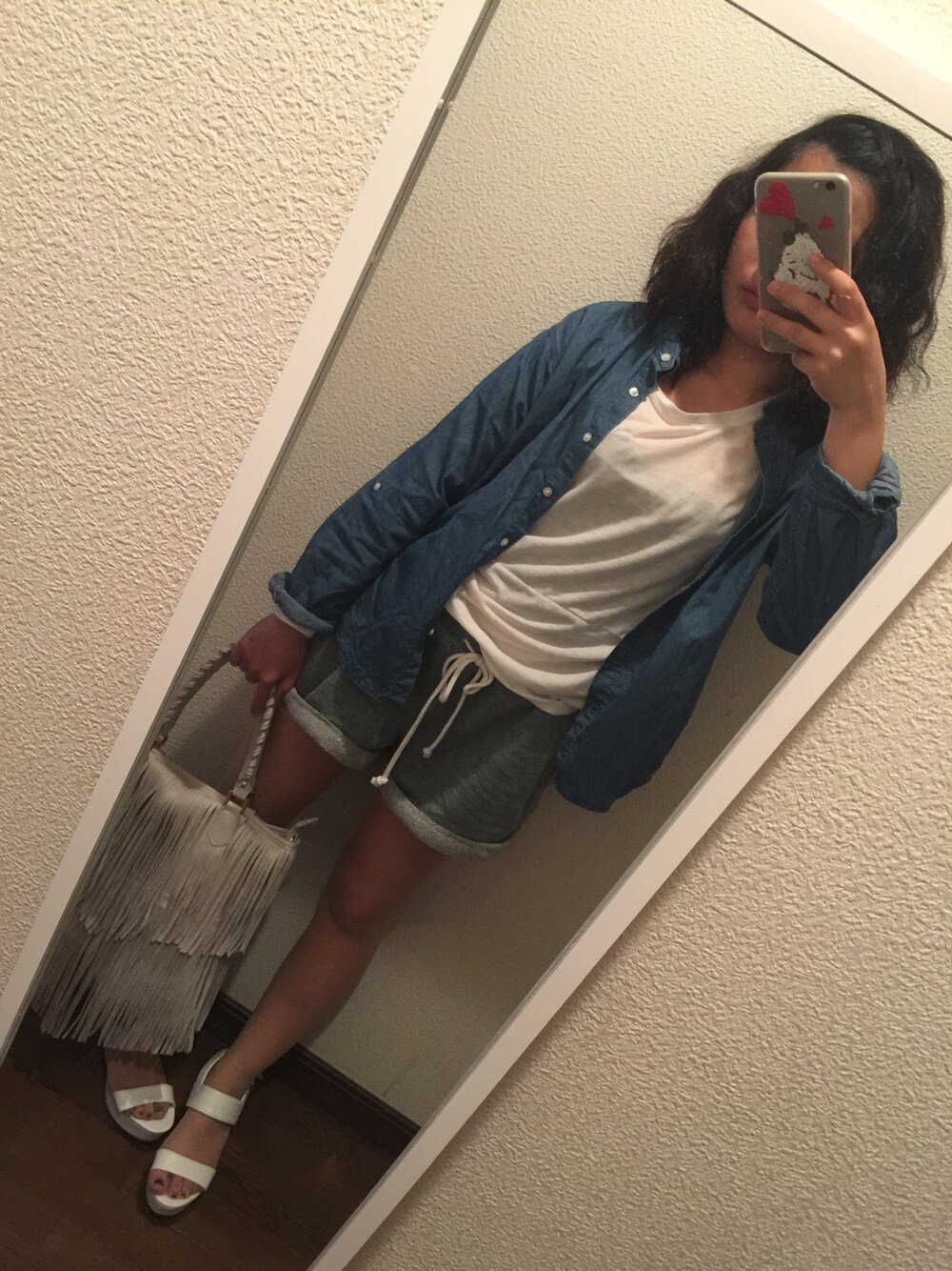 トレンドの物を多く取り入れ、なおかつシンプルに(^O^) スゥエットのショートパンツは本当にずっと欲しくてH&M で一目惚れしたものを着ました。 ダンガリーシャツは日焼けと冷房の防止の為笑 後は定番の白をポイントに入れました 髪型はウェーブアイロンでウェーブを出して 服装がシンプルなのでインパクトを出すために あえてウェーブアイロンで巻きました! この服装で 友達と三ノ宮のイベントOCに行ってきました!