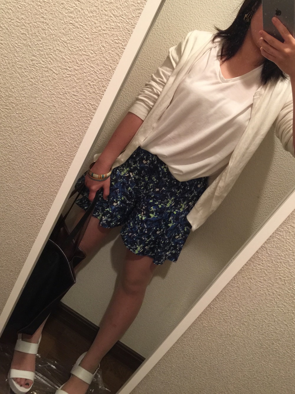 お母さんと2人でお出かけ🎵 お母さんはシックな感じで落ち着いて黒でまとめてあったので 自分は逆に白でポイントカラーにブルーのキュロットスカートと黒のバックでまとまりを