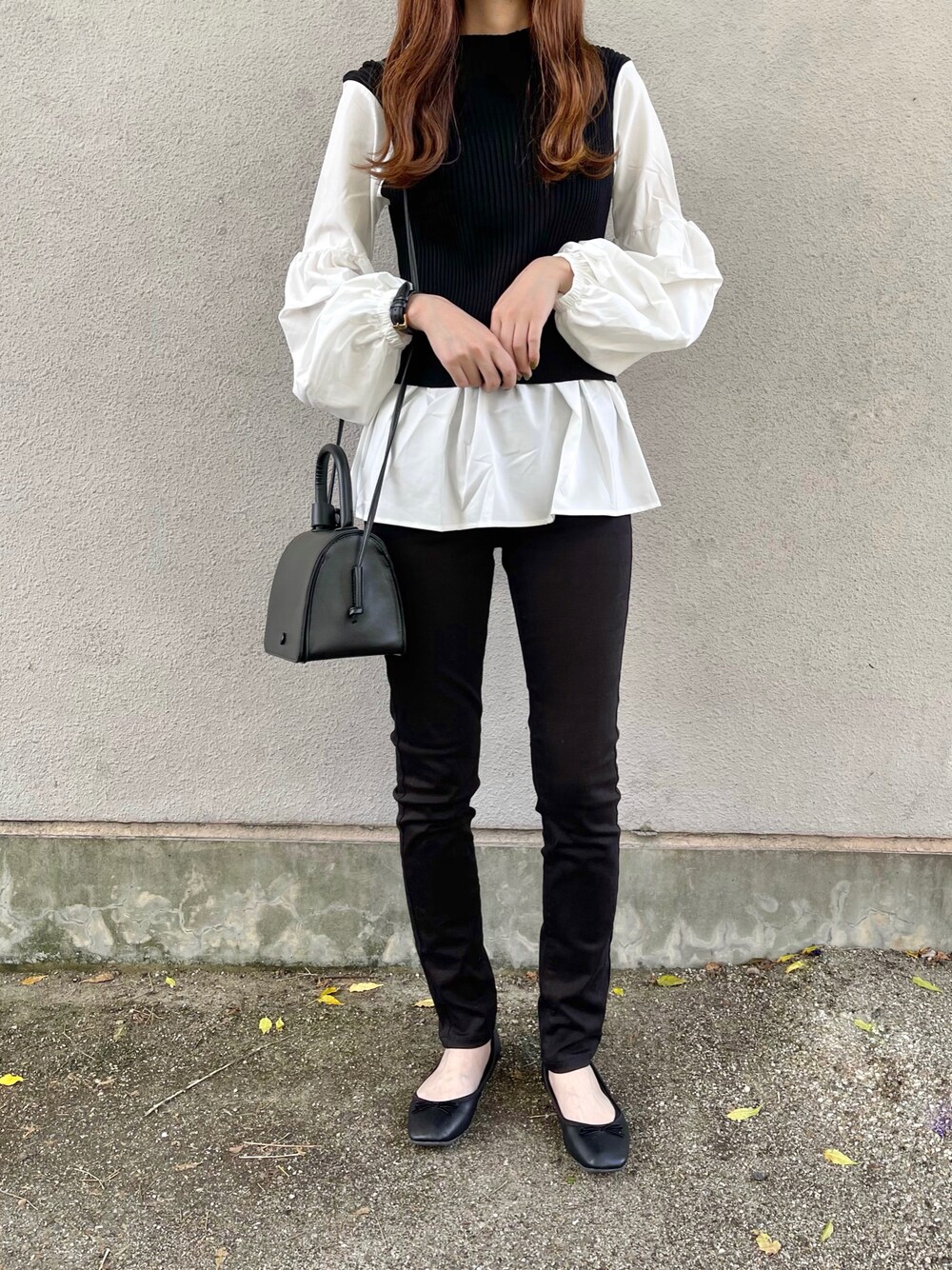 nostalgia_jp のボリューム スリーブドッキングニット着ました🍂 たっぷりのボリューム袖がかわいくて 細かい縦ラインのニットで細見えします🥰 最近買ったUNIQLOの 黒スキニーと合わせました👖🤍 Instagram ☞ @aiko.01234