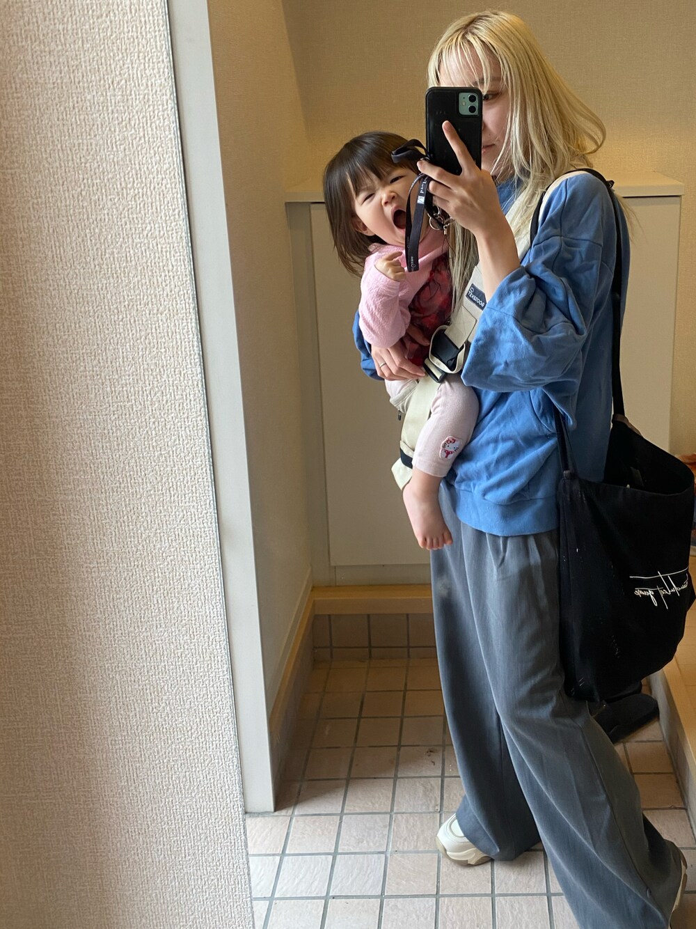 大あくび娘👶 poppyのスウェットかわいいねん🟦 hinariのボトムス初! きれいめに着れてめちゃよかった❤️ 低身長の味方😚