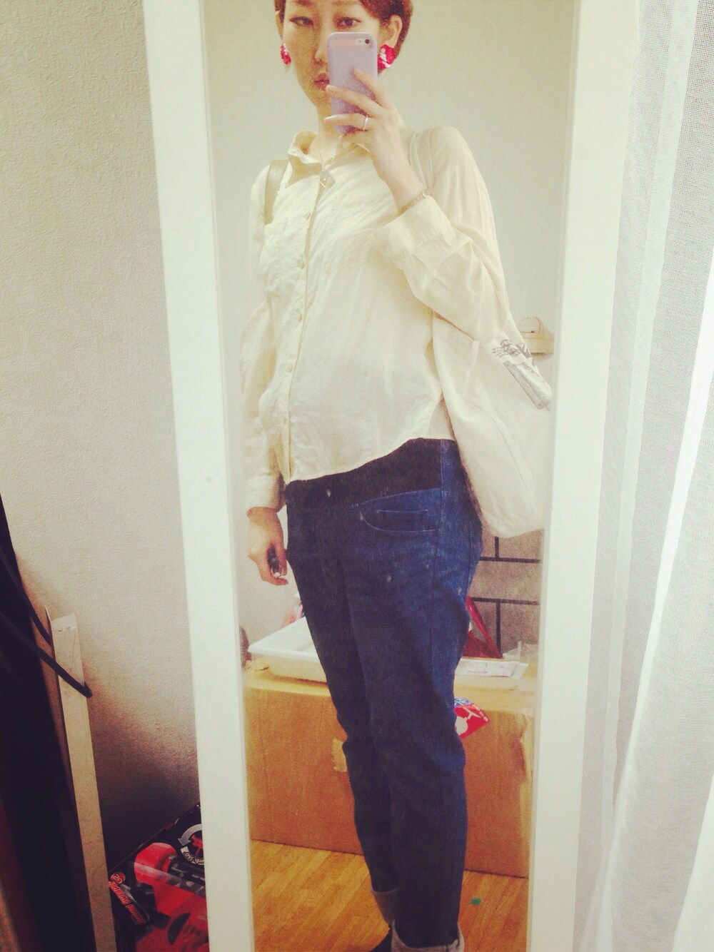 無印にてマタニティデニムをゲット* ショートにしてからずっと欲しかったイヤリングもnote et silenceにてゲット♩にまにま(*˘︶˘*).。.:*♡ シャツ:spick and span
