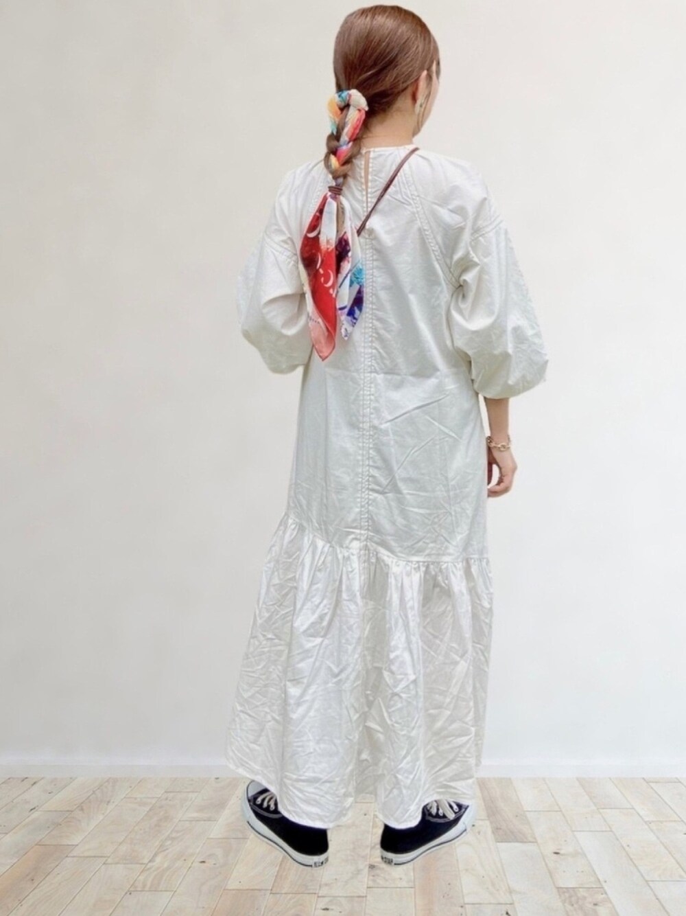 𝚖𝚊𝚛𝚛𝚘𝚗のワンピース「配色ステッチバルーン袖ワンピース」を使ったコーディネート