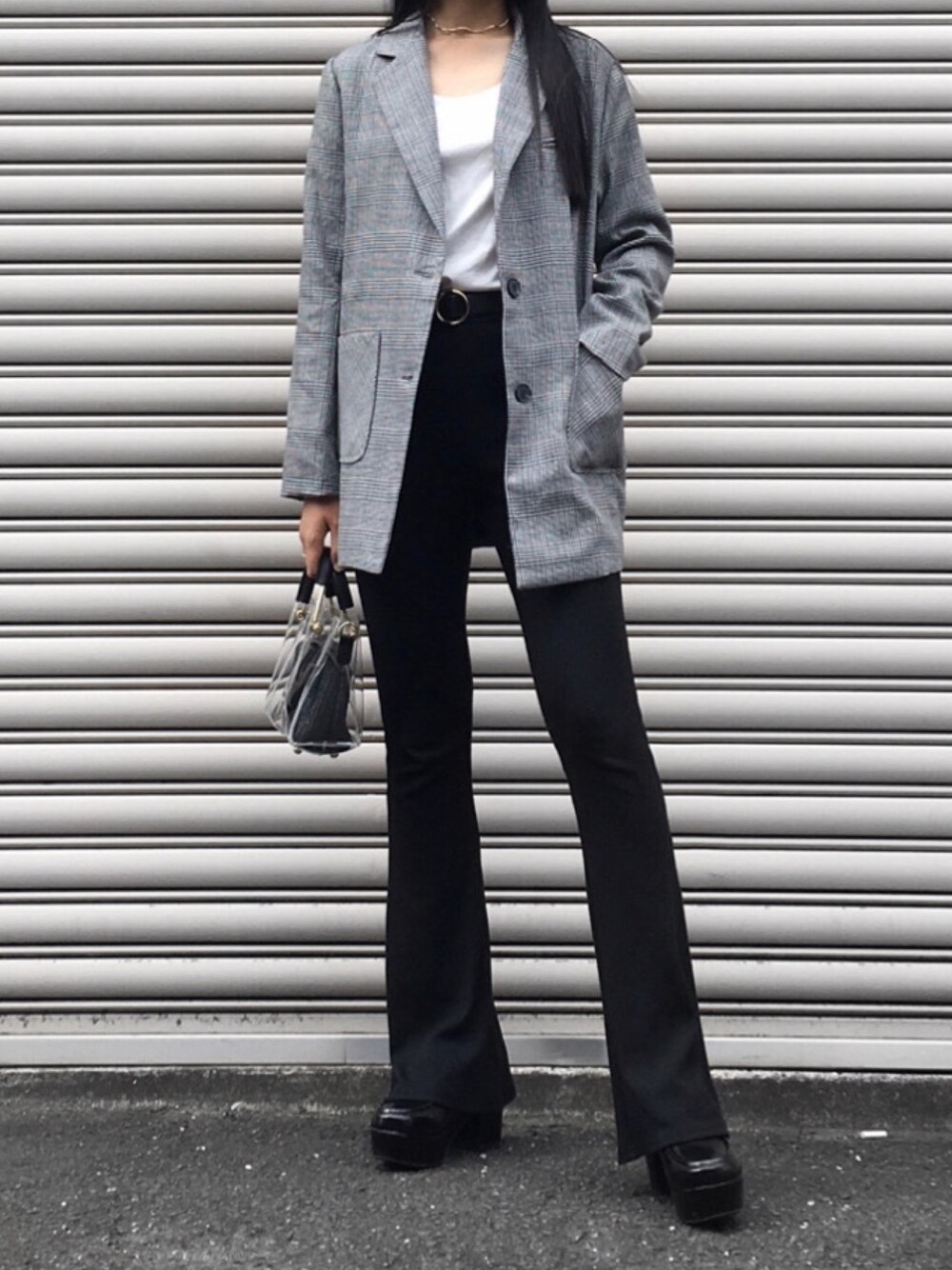 初投稿です✨ ブラックのフレアパンツは着回ししやすいので1本持っておくと便利です! グレンチェックのジャケットを羽織るだけでこなれ感がでます〜
