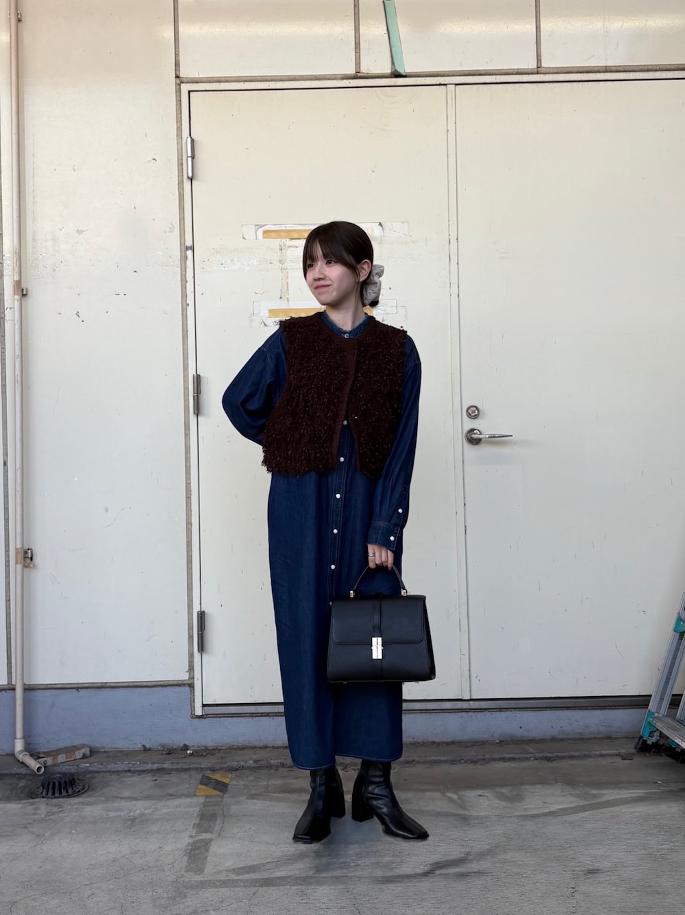 デニムワンピはシンプルなデザインなので、ブラウンのループベストを羽織ることで秋らしく華やかなコーデにしました🪴