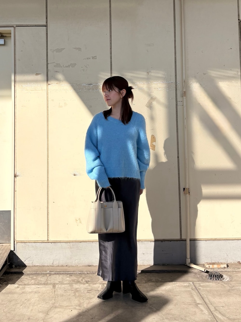 新色のブルーニットを使ったコーデ🫐 濃すぎず薄すぎない鮮やかな色味のブルーなので、コーデが映えて肌の色もパッと明るくみえてオススメです♩