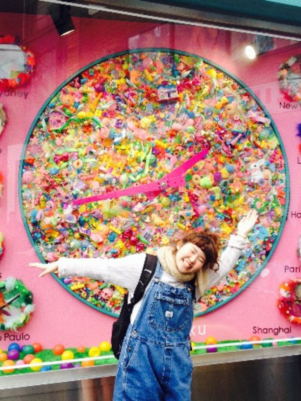 東京旅行の時に もしもしにっぽん? で!時計のまねっこ〜 🐻 下は 見えないけど 🐻さんのタイツみたいなのはいてる!見えないのが悔しいね、 髪型は ボサボサお団子で!💓