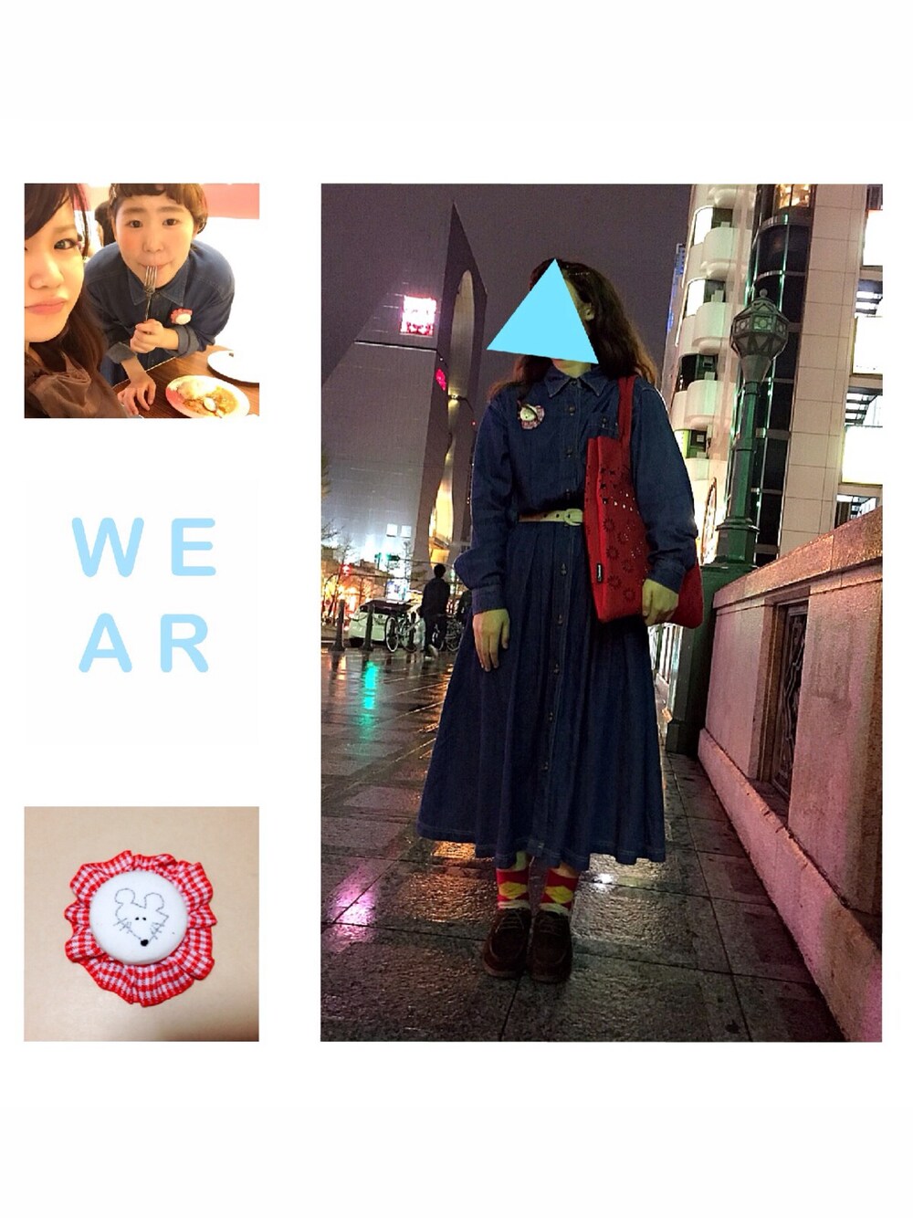 マキシ丈のデニムの古着のワンピースに、差し色を大好きな赤色で コーデしてみました🌷 ワンピースにはベルトでめりはりつけてスタイルアップ✨✨ ブローチはハンドメイドです🐭 けーきをお腹いっぱい食べたくて、スイパラいってきました!やっぱり、おいしいケーキをカロリーを気にせずにいっぱい食べたいな〜 🍰