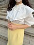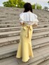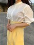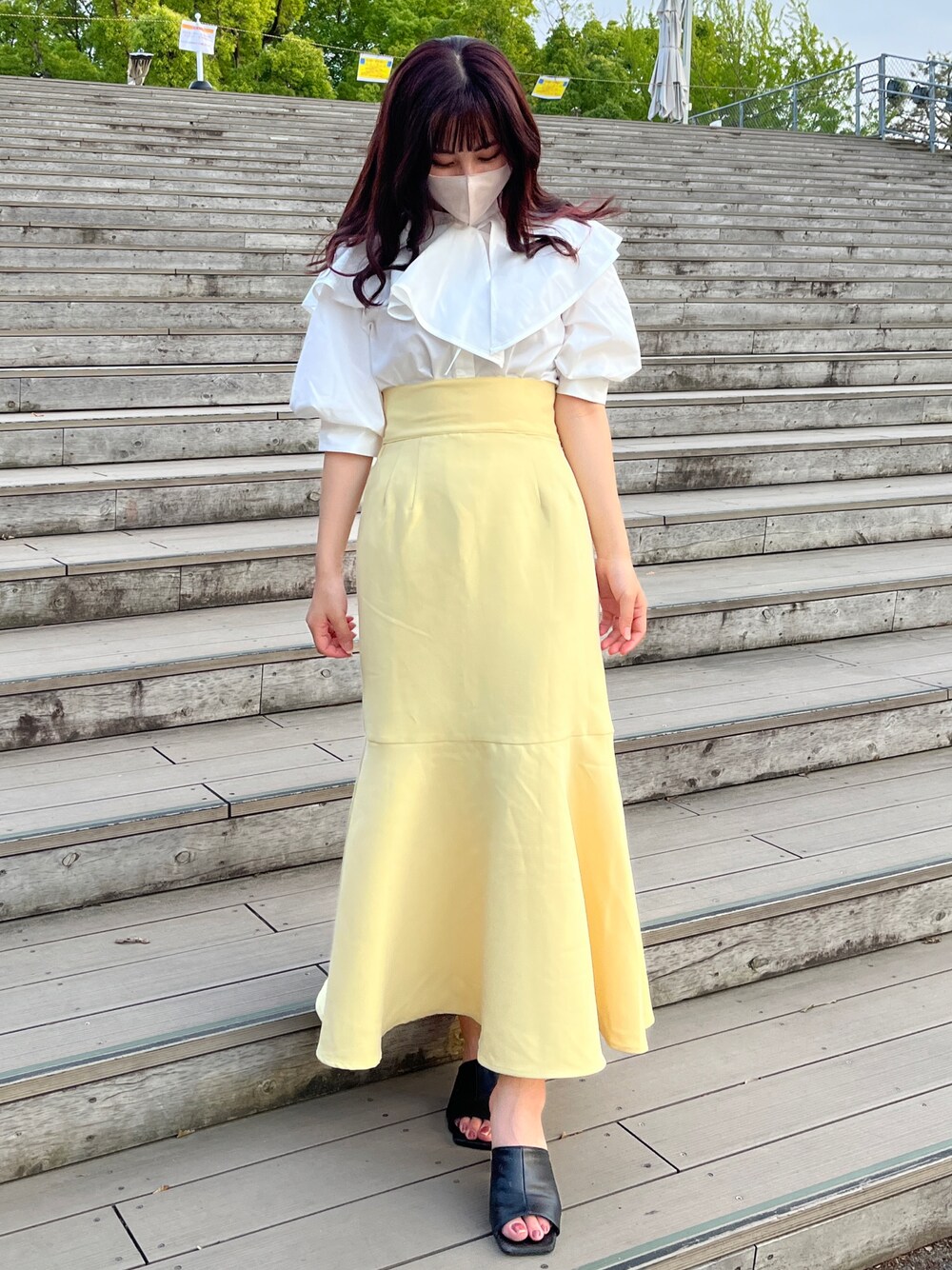 156cm/骨格ウェーブ [tops] スタッフ企画第3弾のアイテムです♡ 付け外し可能なケープ襟がセットになっているノーカラーブラウス🤍 胸元にさりげなく刺繍が入っているのもポイントです☺️ 襟付きはフェミニンな印象に、襟を外すとシンプルですが、刺繍が見えるようになります🥰 肩のボリュームは抑えられたデザインなので、バランスよく着ていただけます♡ [skirt] 後ろの大きめなリボンが特徴のマーメイドスカート🍋🤍 ハイウエストのため、ウエストをスッキリ見せながら脚長効果も期待できます🥰