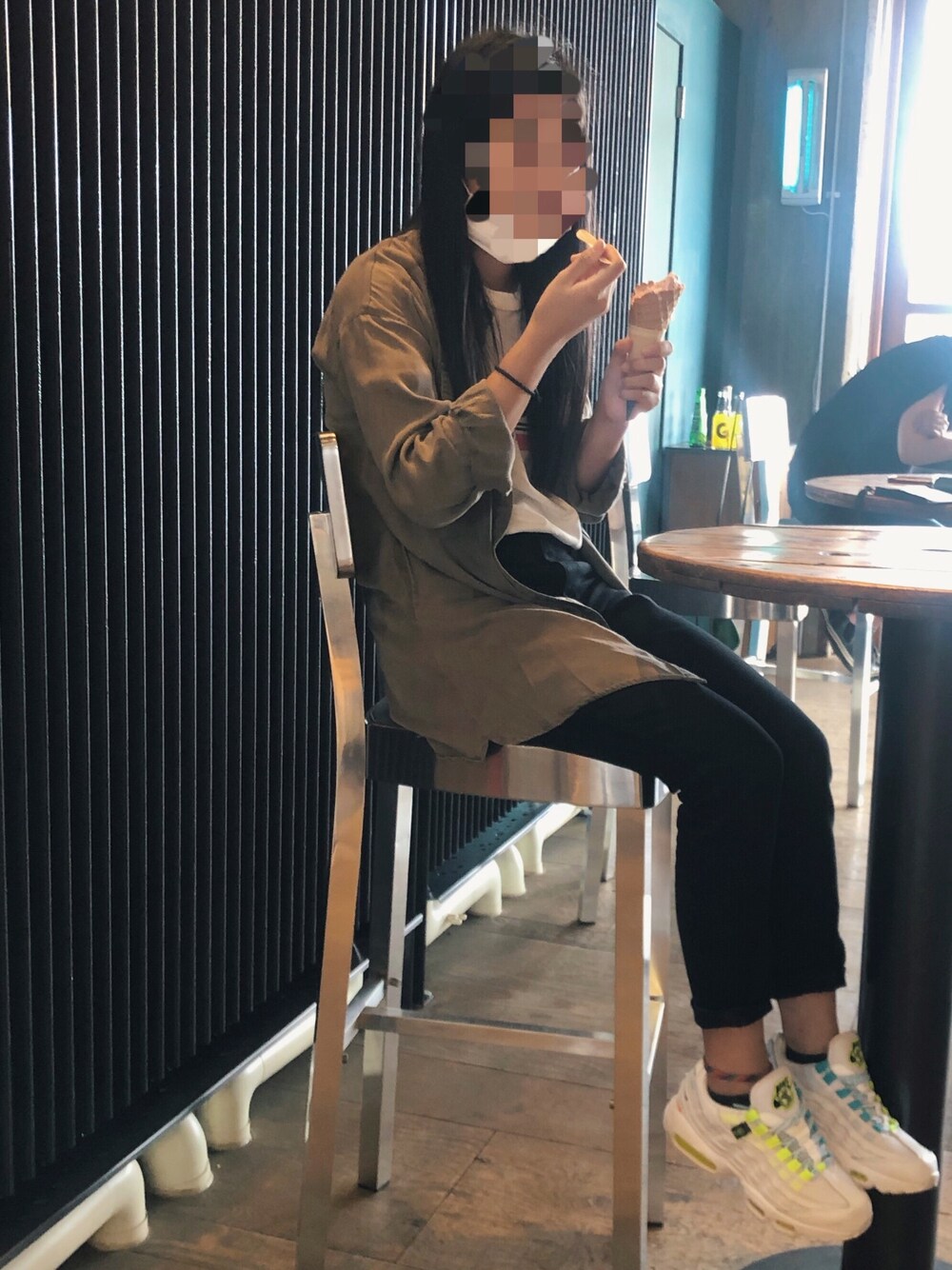 グリーン系のシャツ/ブラウス、ブラック系のパンツ、ホワイト系のスニーカーを着用したレディースの秋コーディネートの1枚目の写真